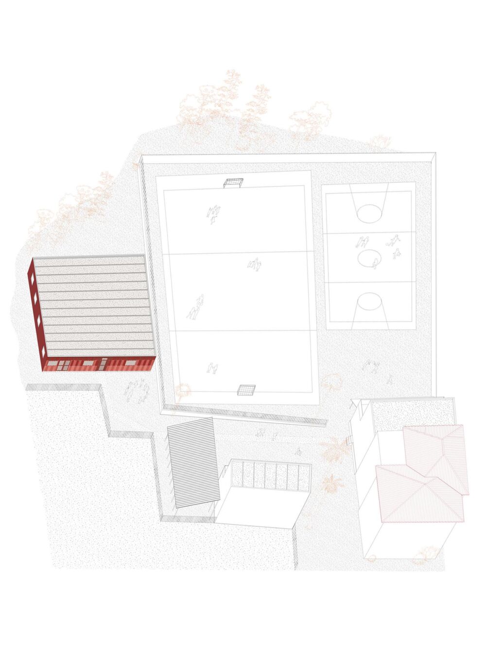 La Falda is an experimental project completed as part of a renovation to a primary school in Alicante, clad in tiles made from recycled bitumen panels. The project formed part of a larger phased masterplan for the development of the school that began in 2015.