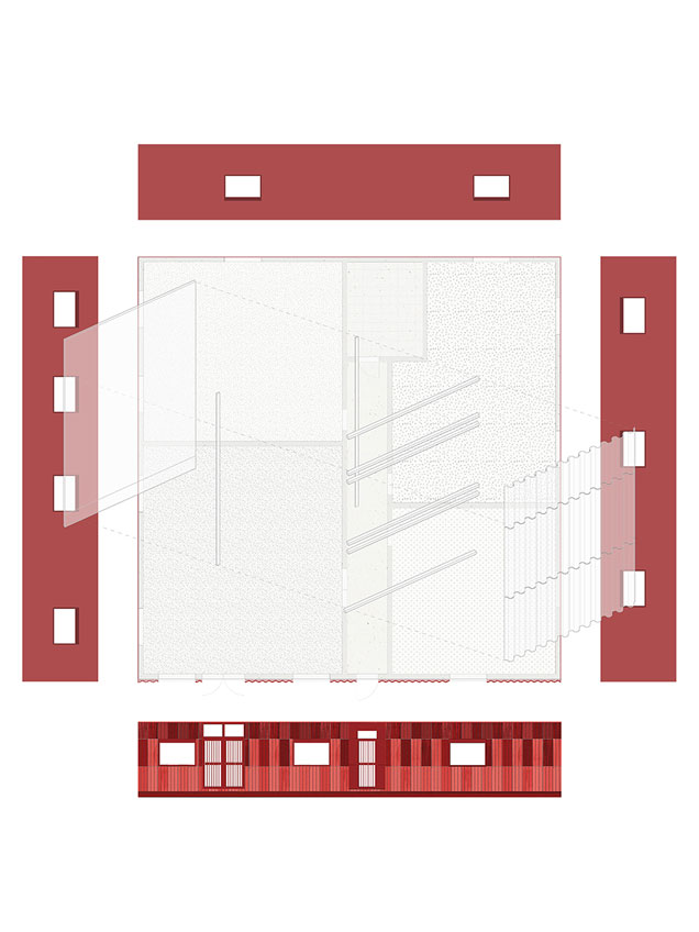 The developed of the project involved rigorous material investigations as well as the testing of paints and different colour variations to help achieve an effect that feels almost crafted. The choice to use the corrugated sheets came from the economy of means and the resources available, yet the versatility and malleability of the material offered an opportunity to create tiled-sized panels that could cover a large area of the façade. The project was a search for new methods of using the material – which is often used to clad warehouses and farm buildings – in an inventive and beautiful way.