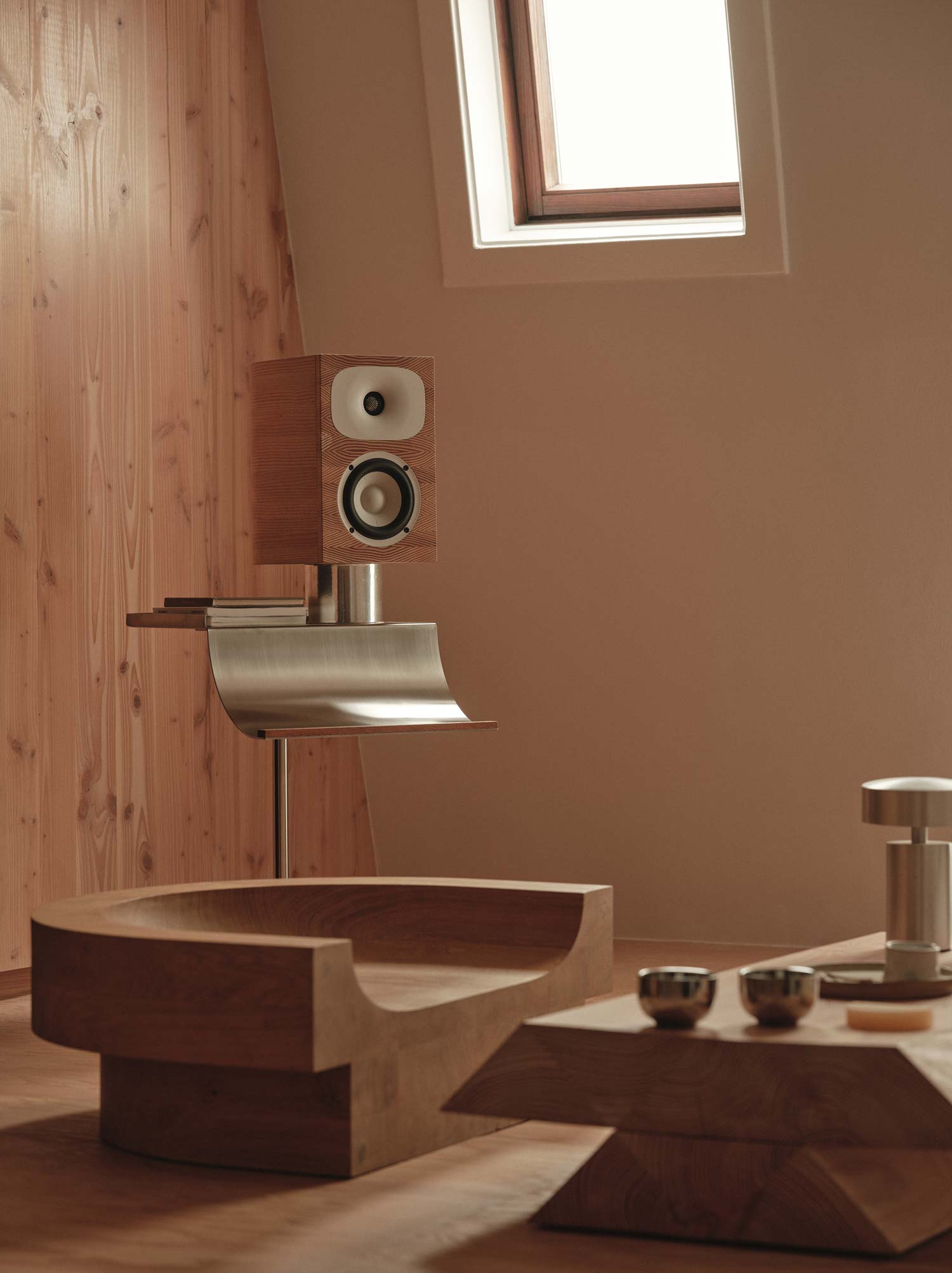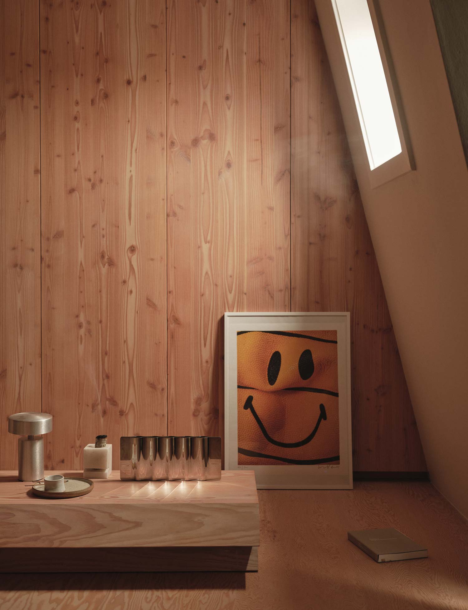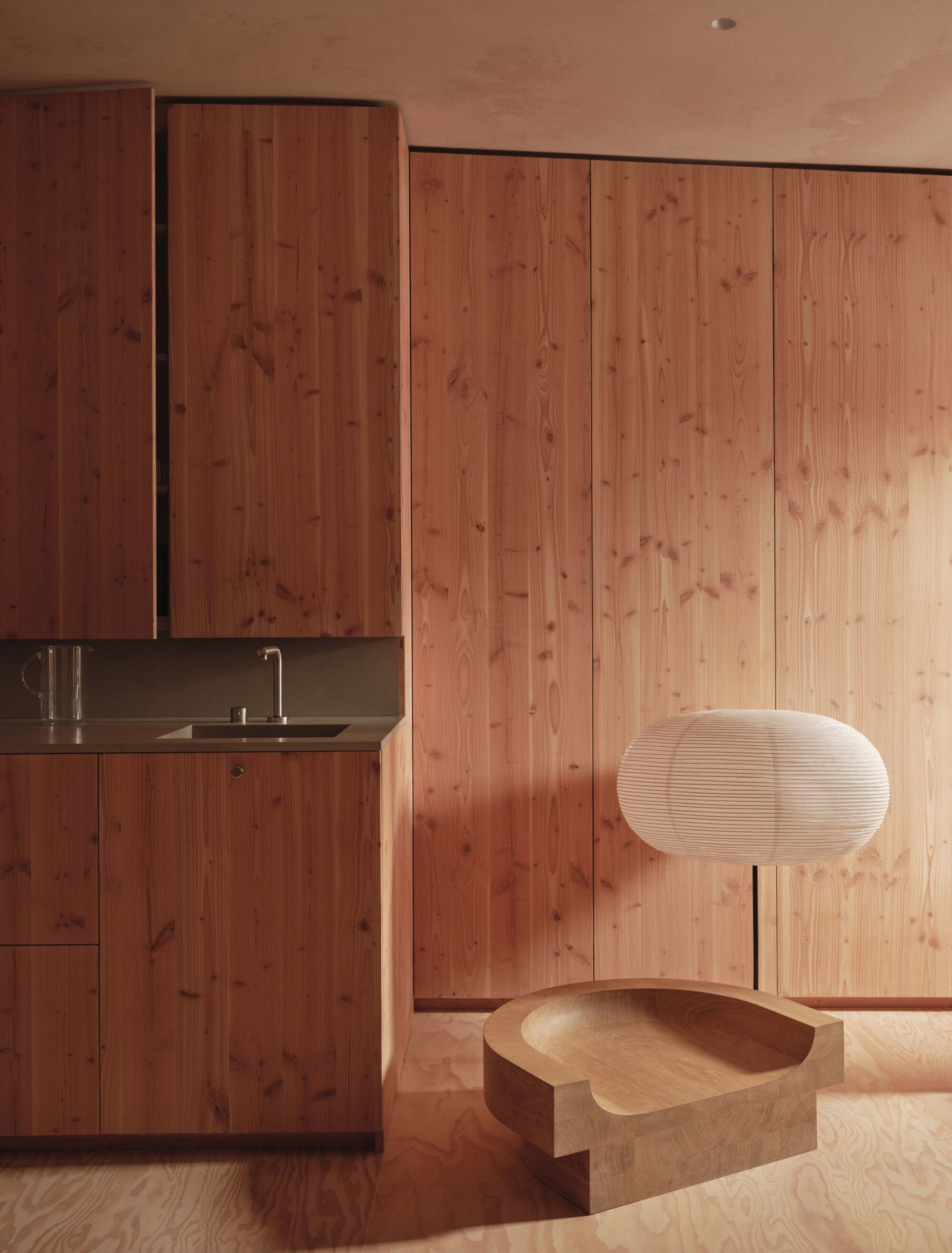 A full-height sliding door connects the main bedroom to the kitchen, allowing borrowed light to filter deep into the plan. A study off the corridor doubles as a workshop space, often populated with found materials that form part of future experiments. Completing the home is a collection of bespoke objects including a stacked coffee table that forms part of an ongoing studio collection, and a custom Douglas fir speaker developed in collaboration with Friendly Pressure and Our Department.