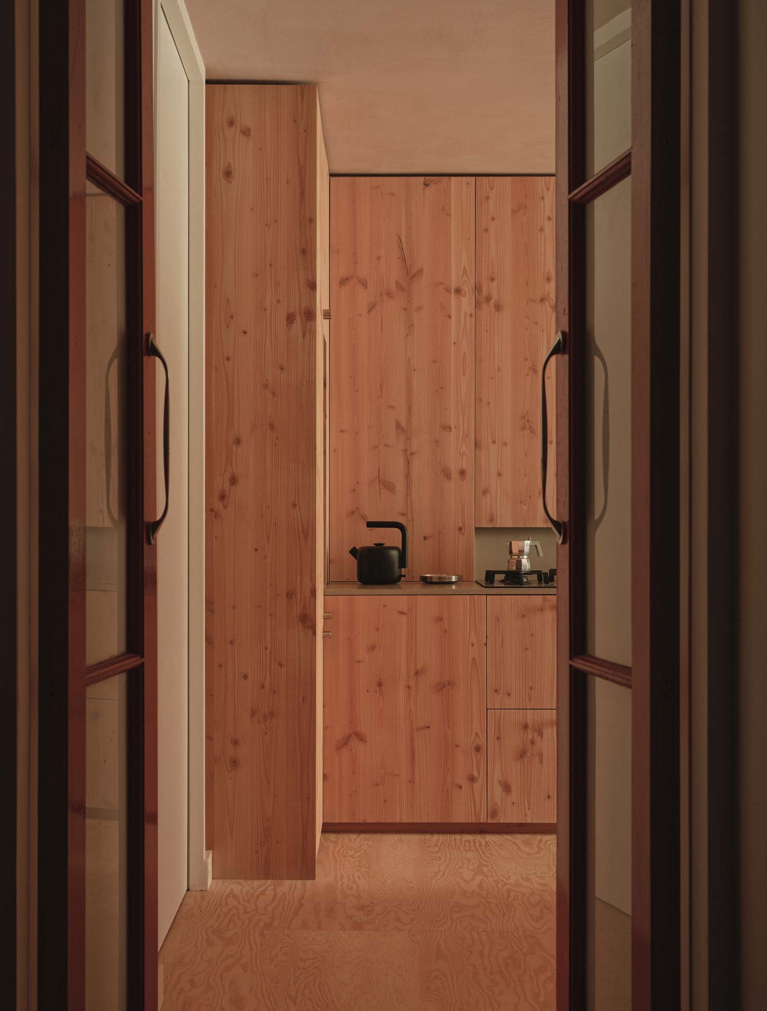 The plan is organised around a generous open kitchen and living space. A large built-in furniture element conceals the functional kitchen components, addresses the original building’s sharp angle and provides substantial storage hidden behind. This intervention helps preserve the calmness of raw plaster surfaces and the warmth of timber throughout.