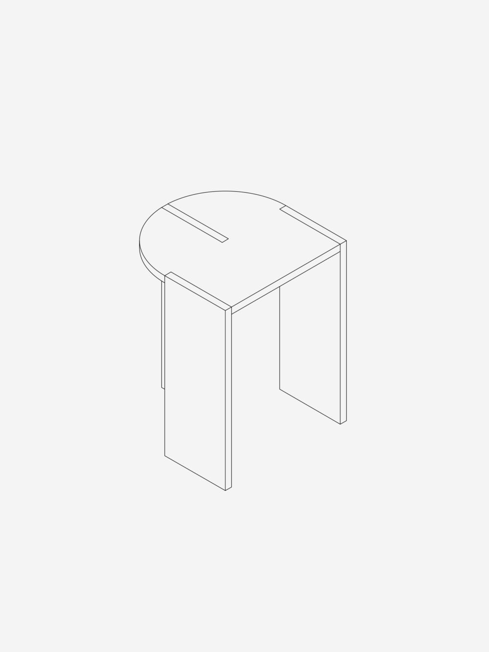 Stools are highly-functional and portable objects that operate between the worlds of work and rest. Following these ideas of functionality, Tri-Stool is made from five pieces, interlocking through notches in the seat. A simple semi-circular shape meets a straight edge creating an elegant form, allowing two pieces to be placed together. This form assumes it can be used in a multitude of ways, including as a combined arrangement to create a side or coffee table.