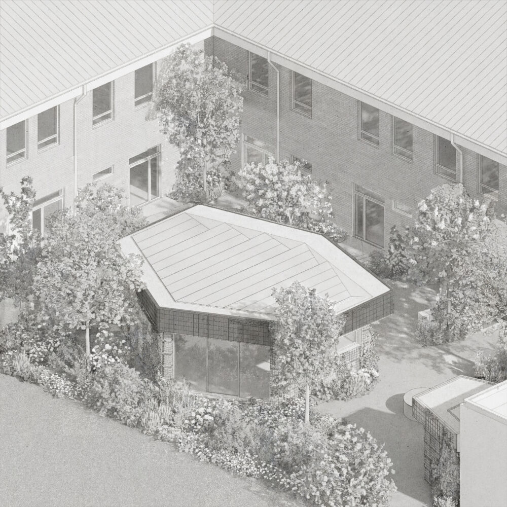 The Community Centre will be located at the northern end of the longhouse, and will include a flexible double- height hall designed to feel like a shared house for its small community, with warm materials and exposed structural rhythm. The Care Home with accommodation for assisted living will be directly connected to the community hall and will feature shared spaces, easily navigable hallways, and a common room with a hearth to encourage social interaction. Rooms are arranged in clusters to avoid long corridors and each one has direct garden access with full-height glazing and timber shutters.